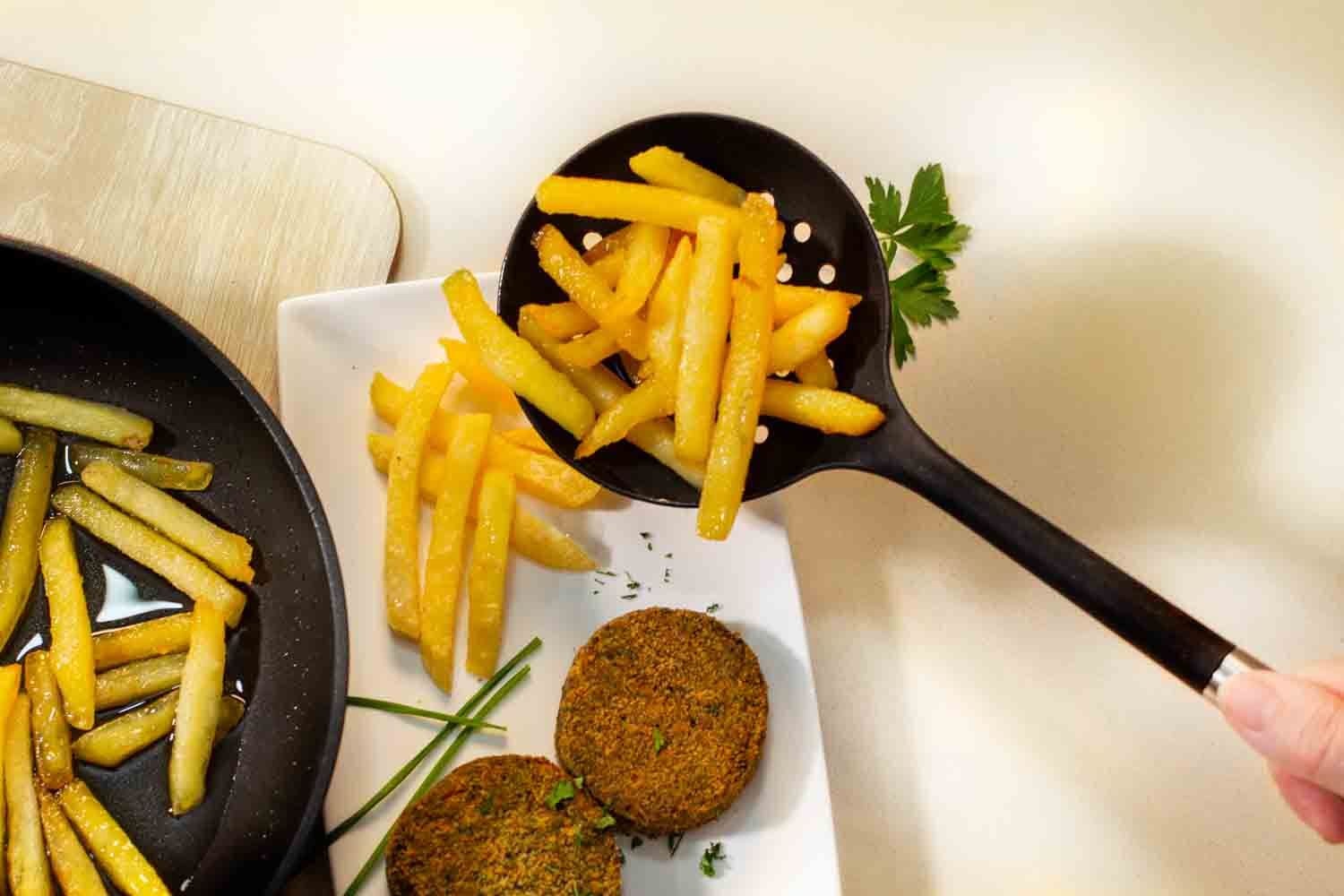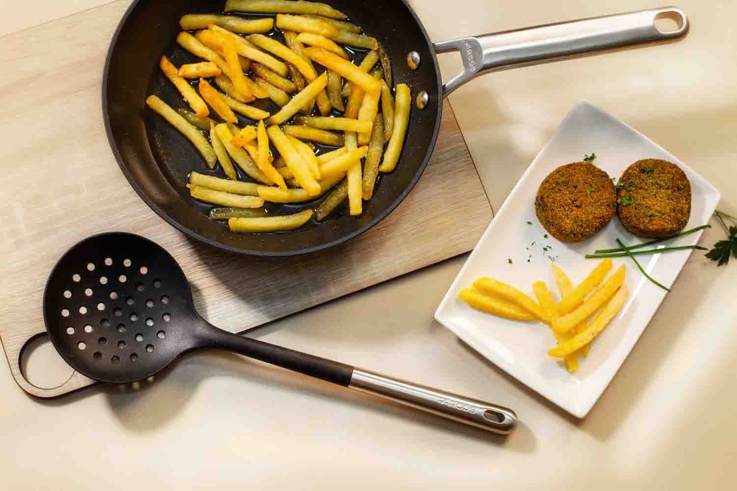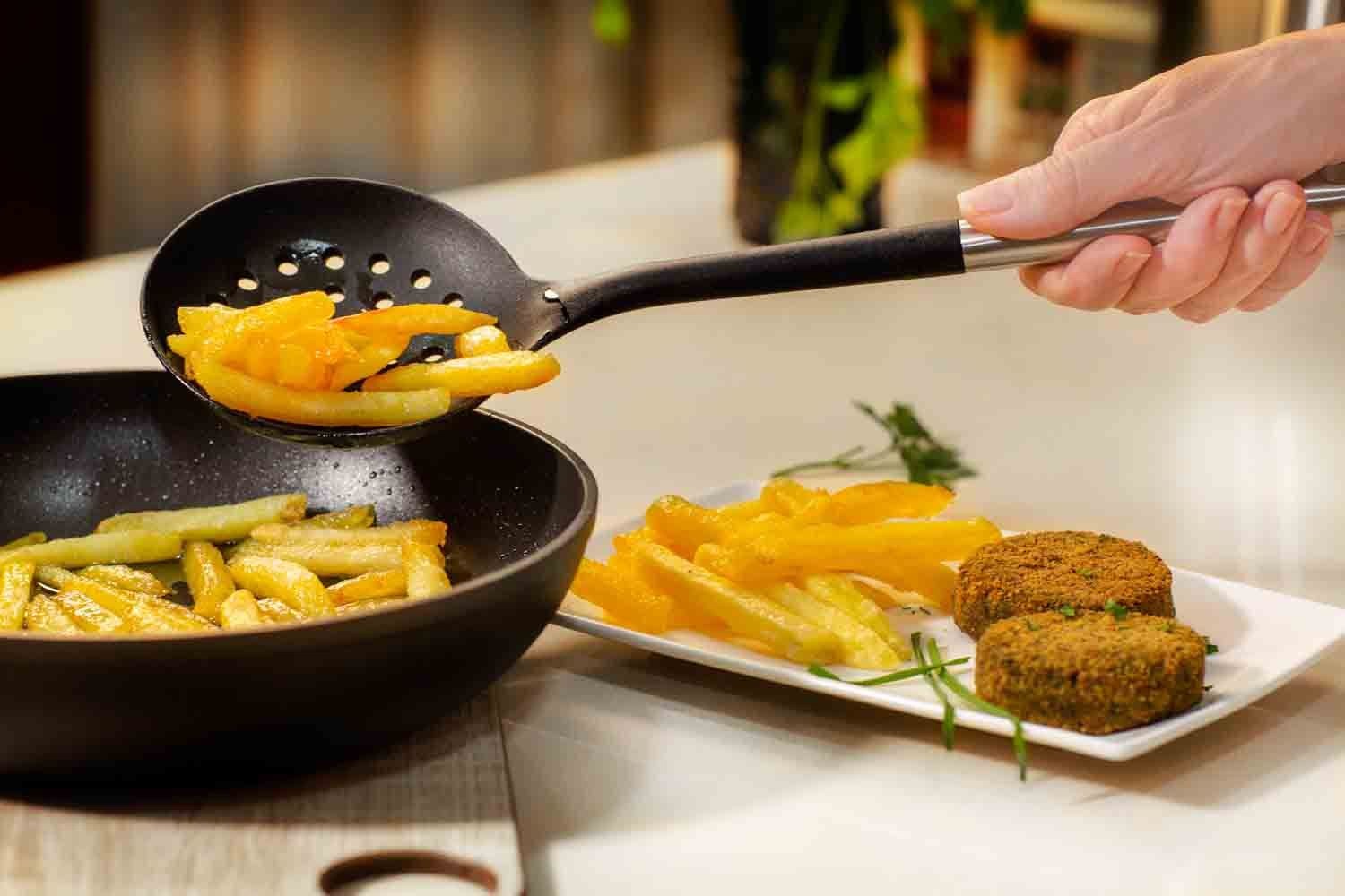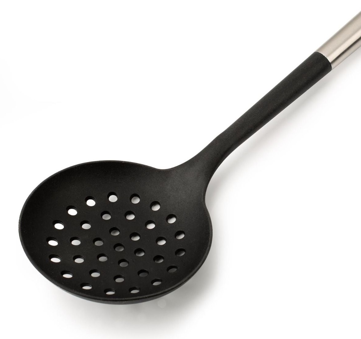 Перфорированная конструкция шумовки идеально подходит для процеживания и слива, позволяя точно процеживать жидкости и сливать воду с продуктов, что идеально подходит для супов, пасты и для приготовления жаренных блюд.