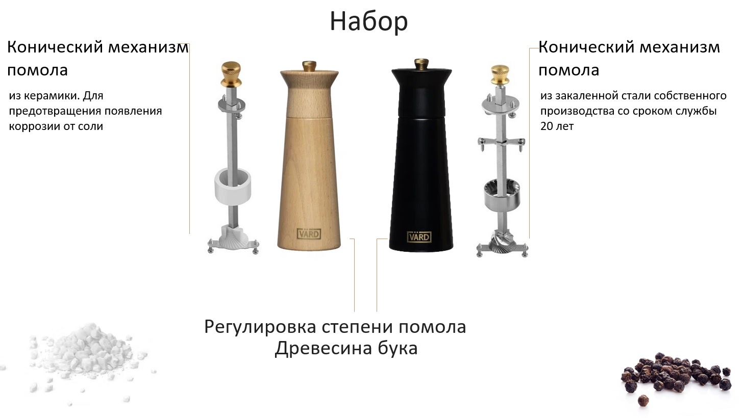 В мельнице для перца используются эксклюзивные конические жернова из специальной закаленной стали с очень высокой производительностью и точностью шлифования. Срок службы таких жерновов до 20 лет.
