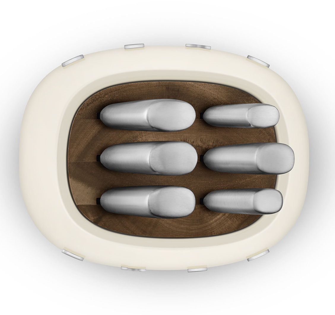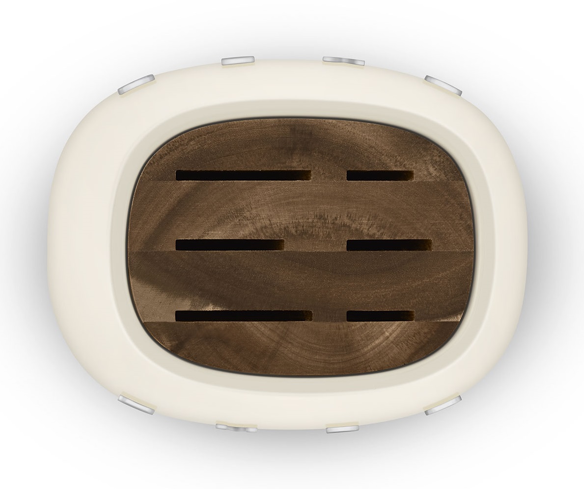 Эстетика: Цвет: кремовый. Отделка: глянцевая. Материал корпуса: углеродистая сталь с порошковой покраской. Материал основания: пластик. Цвет основания: хромированный, глянцевый. Материал ножей: нержавеющая сталь (немецкий сплав). Материал пазов для ножей: дерево акации. Логотип: накладной.